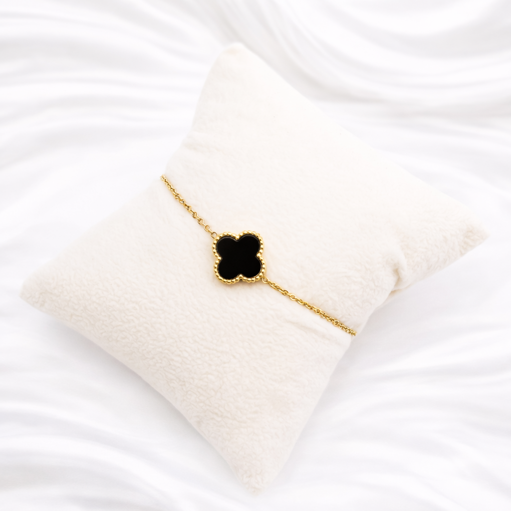 Minimalistička i sofisticirana narukvica od nehrđajućeg čelika s elegantnom crnom djetelinom u zlatnom okviru. Suptilan, luksuzan detalj koji pristaje uz svaki stil — od dnevnog do večernjeg. Otporna na vodu, ne tamni i zadržava svoj sjaj.