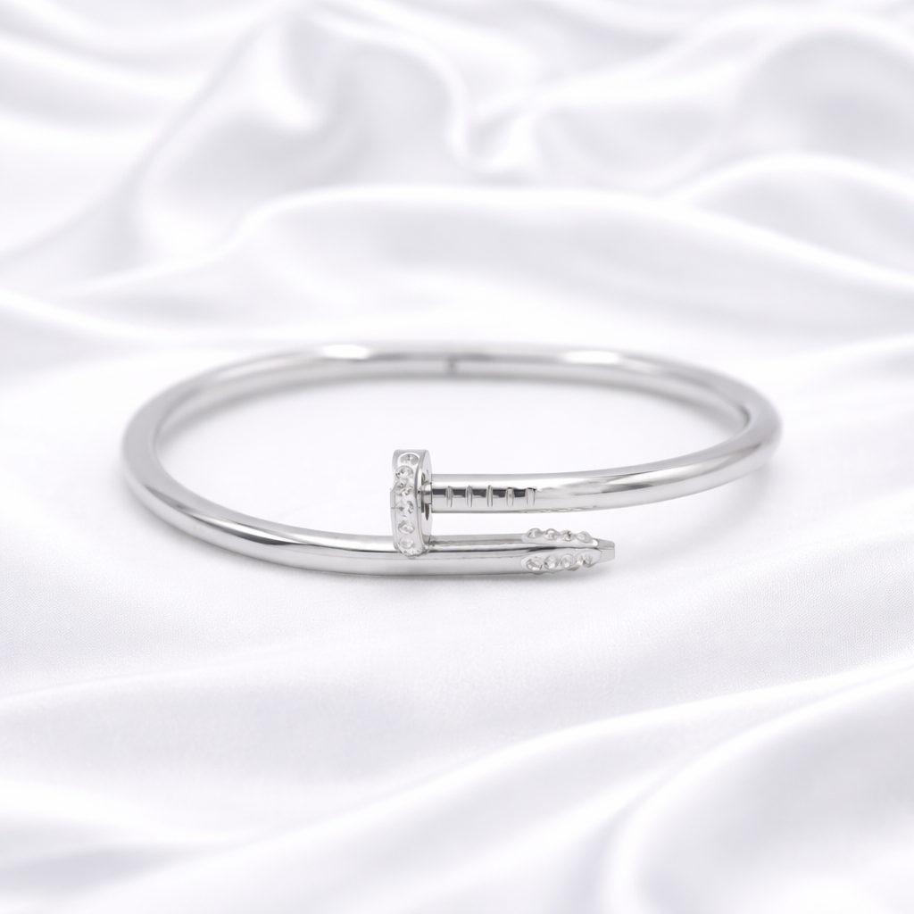 Moderna kruta narukvica od nehrđajućeg čelika inspirirana ikoničnim “nail” dizajnom. Elegantan, minimalistički oblik ukrašen sitnim cirkonima daje joj luksuzan, ali profinjen izgled. Ne tamni, ne pušta boju i savršena je za svakodnevno nošenje — bilo samostalno ili u kombinaciji s drugim narukvicama za stacked efekt.